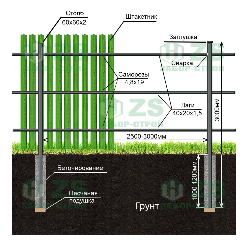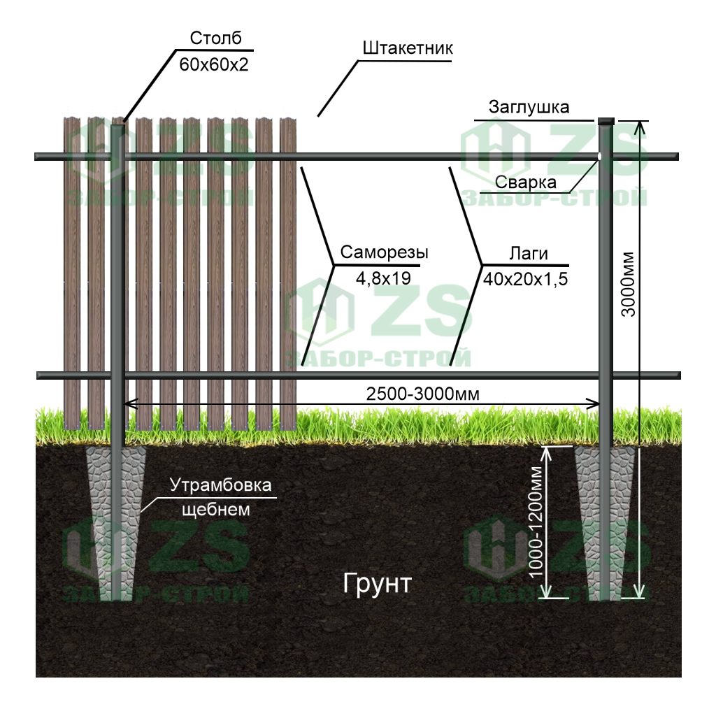 Конструкция забора из евроштакетника на забивных столбах: